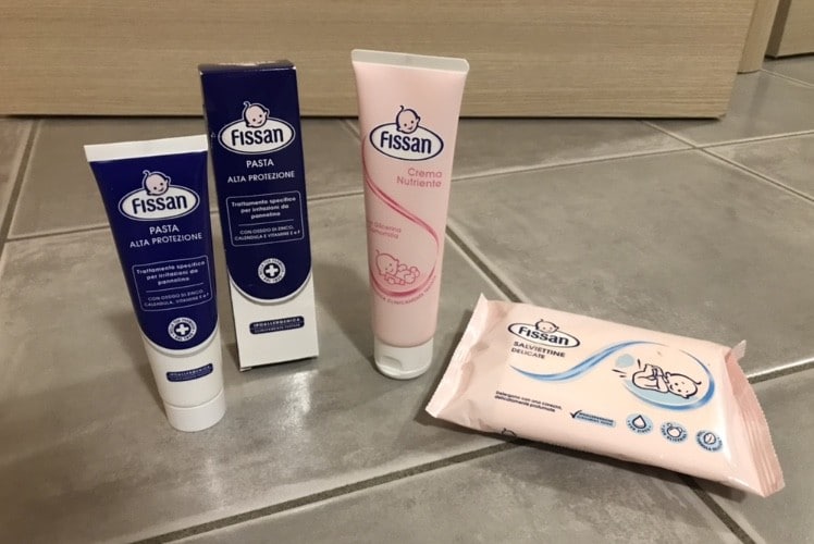 Borsa comoda e spaziosa, contiene i prodotti necessari per la cura ed il cambio dei più piccoli, fin dai primi giorni di vita. La borsa contiene: 1 crema viso protettiva con prodermina, 1 detergente neutro, con estratti naturali di camomilla, 1 pasta Fissan alta protezione, che protegge e lenisce le irritazioni da pannolino, con ossido di zinco, calendula e vitamine E e F, 1 confezione da 15 pezzi di salviettine delicate, 1 bagno primi mesi, che deterge delicatamente corpo e capelli, nutre e lenisce la pelle lasciandola morbida, con estratti naturali di camomilla e glicerina.