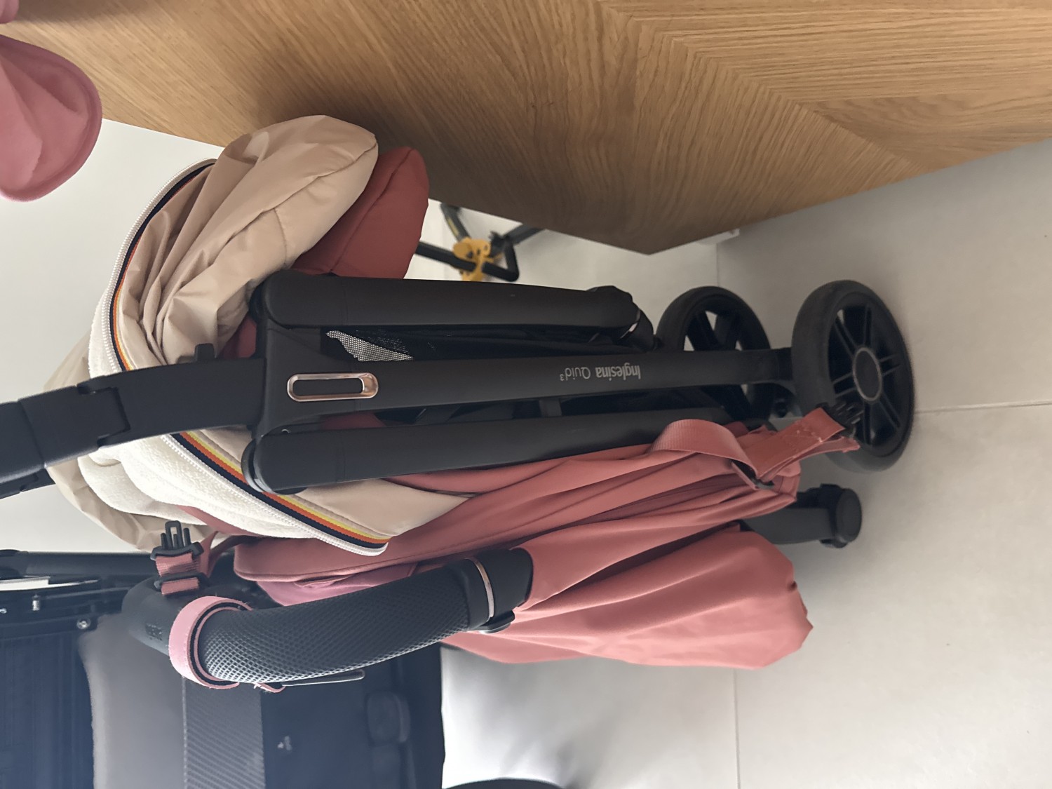 Dal punto di vista pratico, il passeggino può essere chiuso con una sola mano e resta in piedi da solo una volta piegato. La maniglia e la cappottina non toccano il pavimento, mantenendosi pulite. È inoltre dotato di una tracolla per il trasporto, di un cestello capiente per gli oggetti di uso quotidiano e di ruote posteriori rimovibili per facilitarne la sistemazione. La borsa per il trasporto è inclusa.