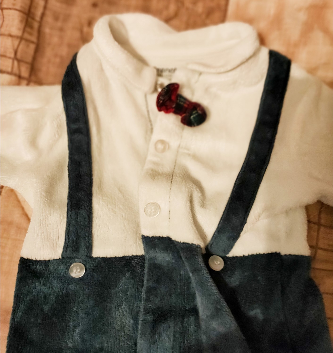Tutina in ciniglia da bambino con babbucce coordinate e salopette con camicia bianca e pantalone con bretelle blu notte. Dotata di papillon in scozzese. Morbida e confortevole ha chiusura con bottoni automatici sul fronte e sul cavallo.