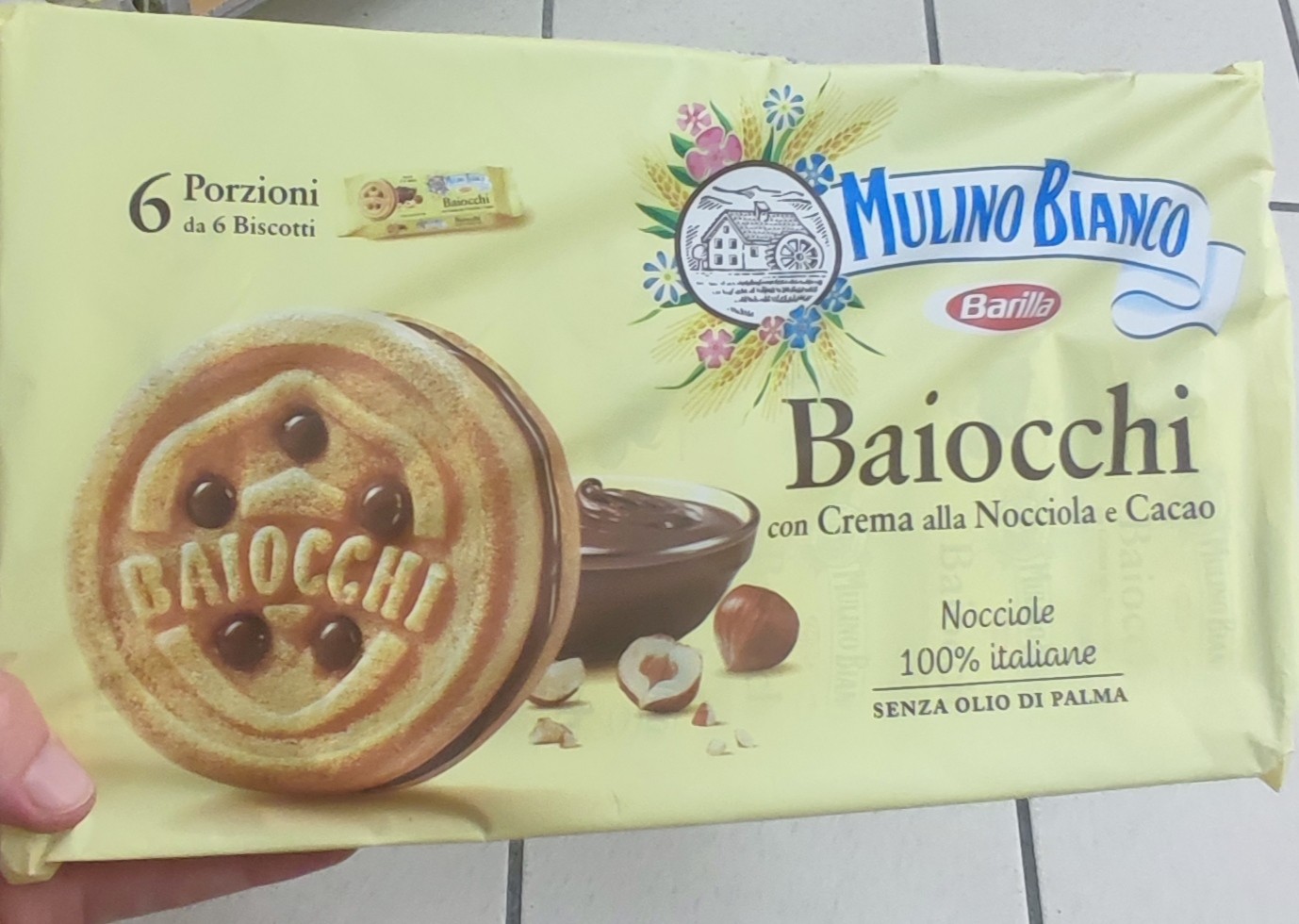 Un cult della biscotteria del Mulino i Baiocchi rappresentano lo squisito incontro tra pasta frolla e crema alle nocciole risultando un connubio perfetto di croccantezza e cremosità .Ottima la lista degli ingredienti che esclude ogm, coloranti ,grassi idrogenati e conservanti. L'unico problema è che uno tira l'altro.