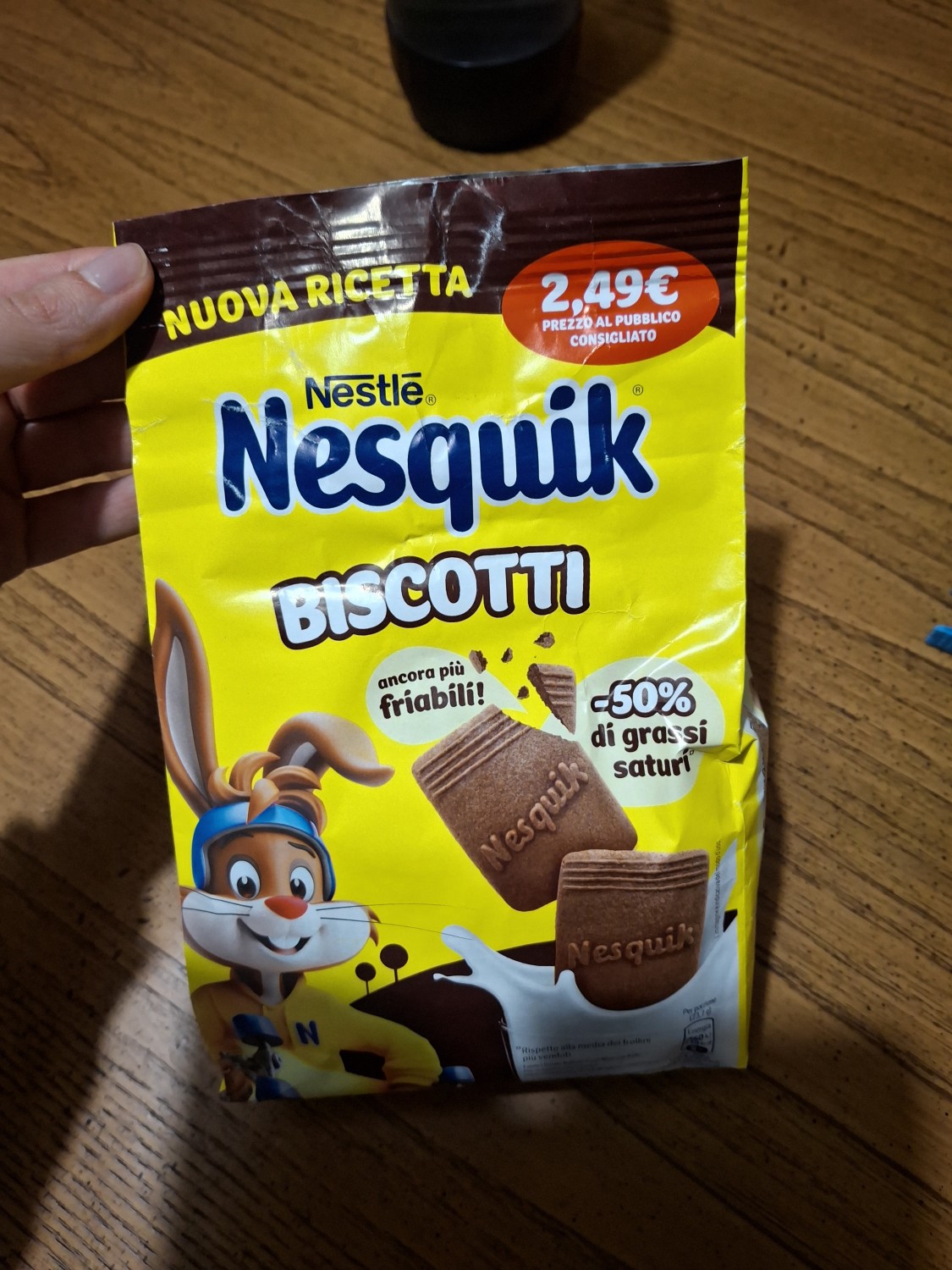 Biscotti frollini al gusto di Nesquik, prodotti con latte italiano e cacao certificato Rainforest Alliance. Ideali a colazione, da soli o da inzuppare.