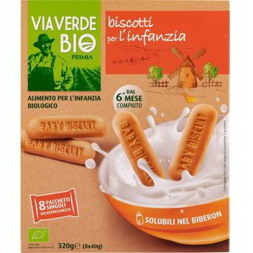 Biscotti per l'infanzia da agricoltura biologica, indicati a partire dal 6° mese compiuto. Prodotti con ingredienti selezionati e di derivazione biologica, sono solubili nel biberon.
