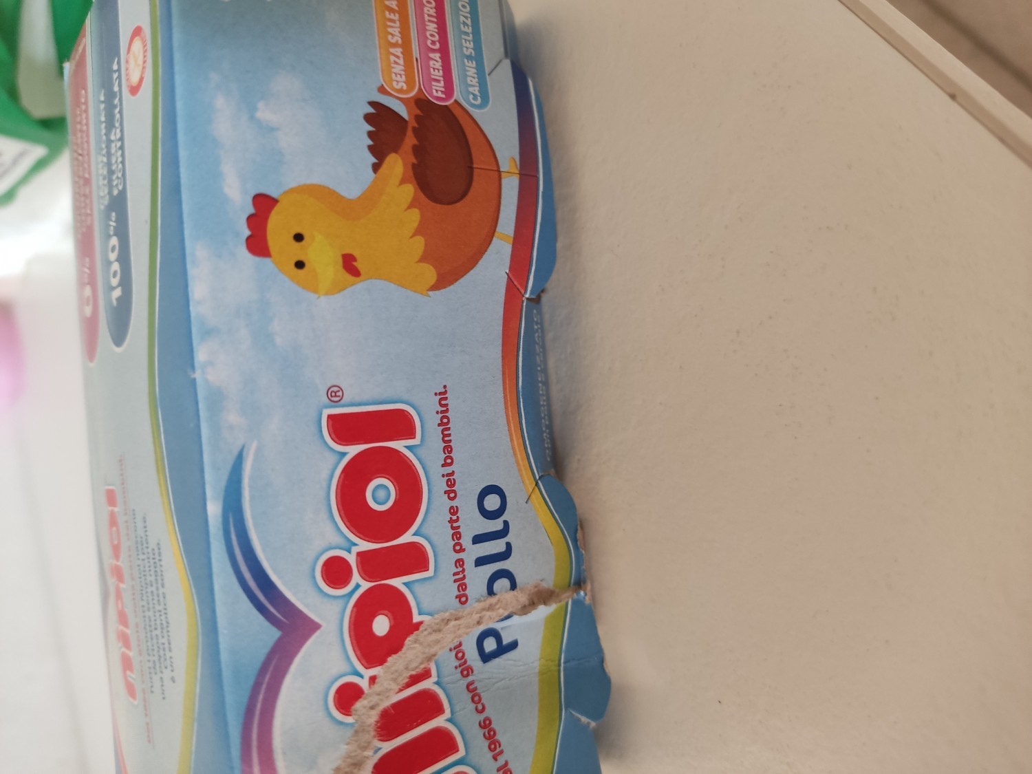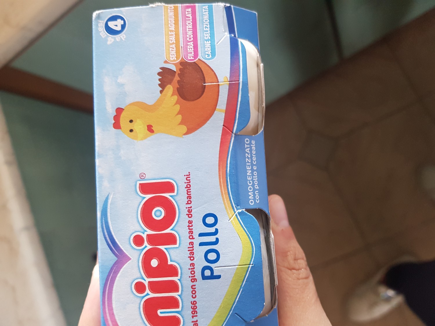 Omogeneizzato con pollo e cereale preparato con carne selezionata, senza sale aggiunto. Ingredienti: acqua di cottura, carne di pollo (25%), amido di mais, farina di riso(3%), succo concentrato di limone.