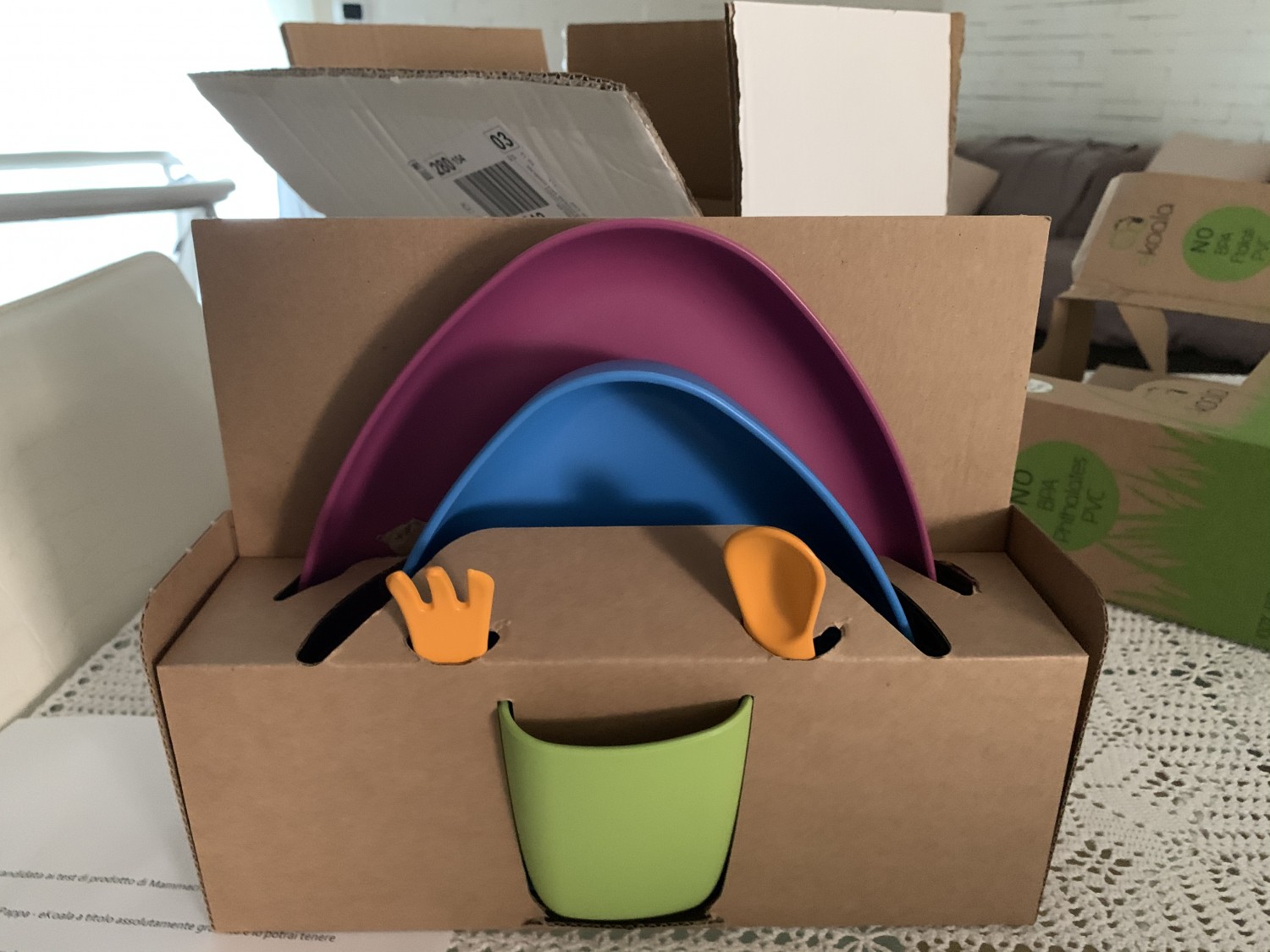 Set pappa che comprende piatto piano e fondo, due posate e un bicchiere, interamente realizzati in bioplastica derivata dal mais: una sostanza naturale robusta come la plastica, ma senza sostanze pericolose - come Melamina, BPA o ftalati - presenti in molte plastiche tradizionali che potrebbero, se rilasciate nel cibo, venire assimilate dai bambini. Lavabili a mano e riutilizzabili, hanno dimensioni e forma ergonomica studiata per essere utilizzati facilmente dai bambini.