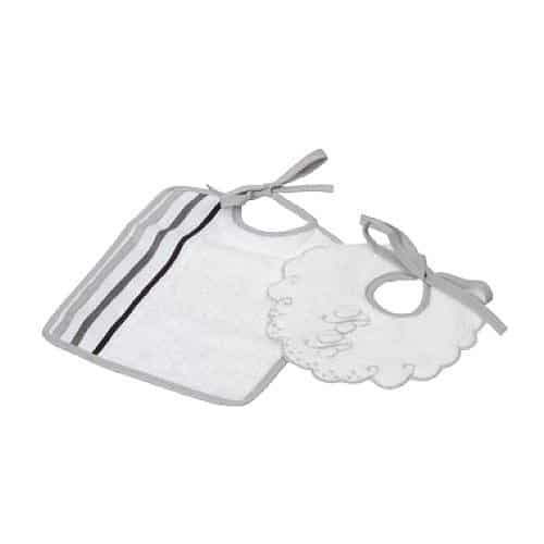 Il Set Pappa Lait Baby è una coppia di bavaglini ricamati di dimensioni diverse che accompagnano il piccolo nella crescita, dalla poppata allo svezzamento. Il bavaglino piccolo è indicato per il periodo dell'allattamento e della dentizione, per mantenere i vestiti asciutti da latte, saliva e piccoli rigurgiti; il bavaglino grande, invece, è indicato dallo svezzamento in poi con l'inizio delle pappe. Materiale: 100% cotone di origine controllata, lavorazione naturale. Colori: bianco e grigio.