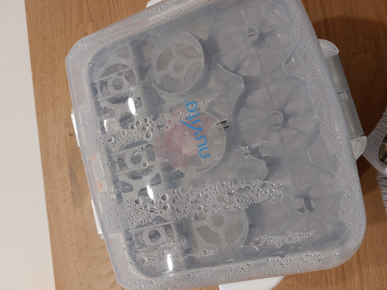 Sterilizzatore per forno a microonde compatto e leggero, adatto sia in casa che in viaggio. Ha manici e chiusura a clip laterali per una maggior sicurezza durante l'uso. Dopo averlo estratto dal forno, se il coperchio non viene sollevato, il contenuto rimane sterile per 24 ore. Può contenere fino a 3 biberon a collo largo e accessori, come succhietti e tettarelle. Elimina germi e batteri in maniera naturale senza residui chimici, odori o sapori in soli 4-6 minuti.