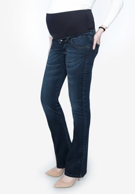 Jeans a zampa di elefante, con fascia alta. Con tasche posteriori e anteriori. Regolabile grazie all'elastico interno. Disponibile in denim scuro e nero.