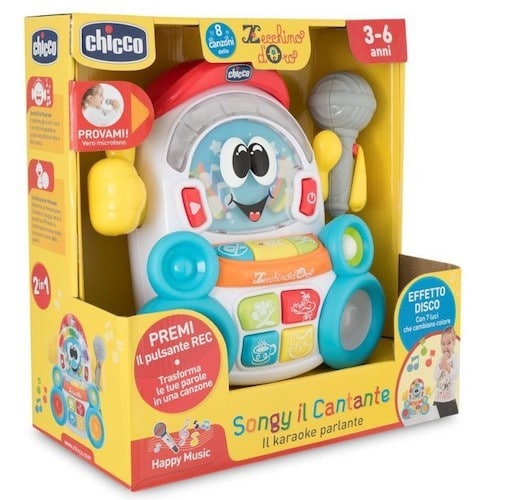 Karaoke che trasforma la voce in canzone. Allegro e colorato, è dotato di 7 luci a led che attivandosi creano un’atmosfera disco. Parlando nel microfono amplificato staccabile trasforma magicamente...