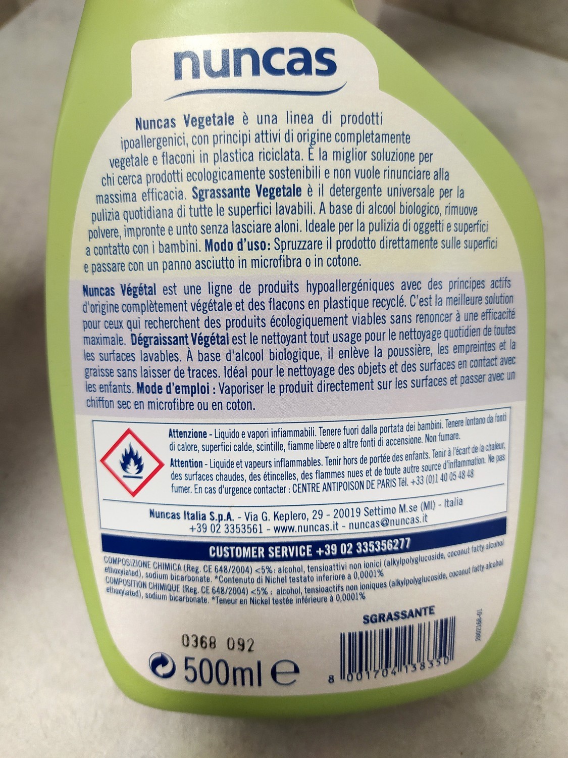 Sgrassatore multiuso senza risciacquo della linea Nuncas Vegetale, ideale per rimuovere polvere, impronte ed unto da legno verniciato, laminato, ceramica e materiali plastici, senza lasciare aloni.