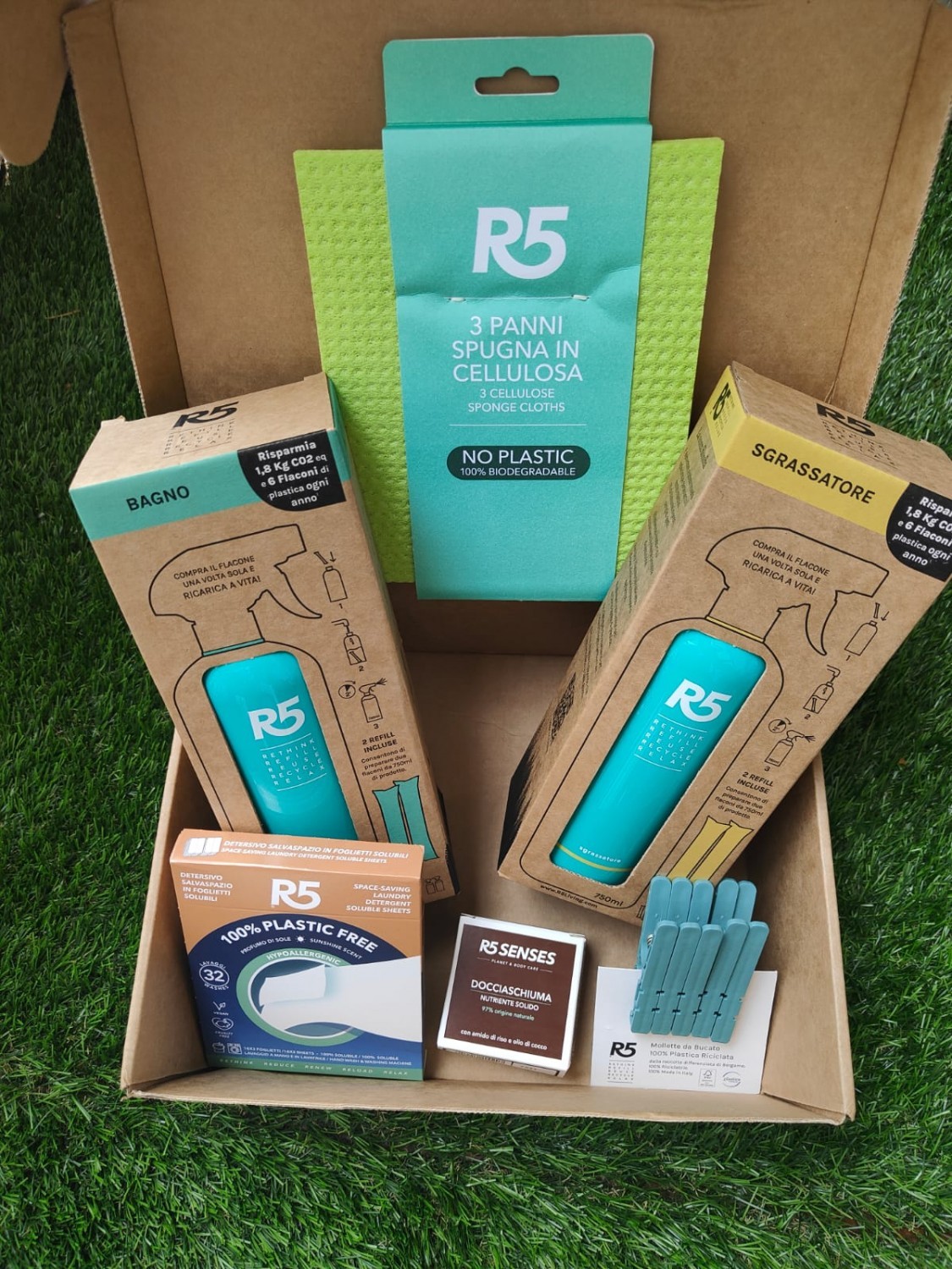 Il sistema di prodotti e kit R5 è un concetto innovativo di detergenti per la cura della casa, creato pensando all'ambiente e alla sua tutela, operando in modo responsabile, sostenibile e trasparente. Promuove l'eliminazione di packaging inutile, riduce il trasporto di acqua e il consumo di plastica monouso - attraverso flaconi e ricariche permanenti - riducendo la CO₂ equivalente immessa ogni giorno nel Pianeta.