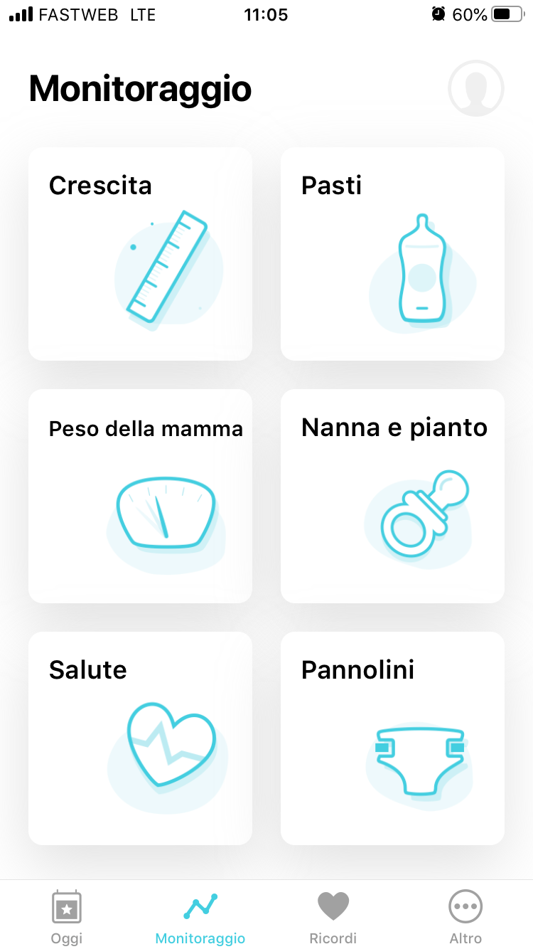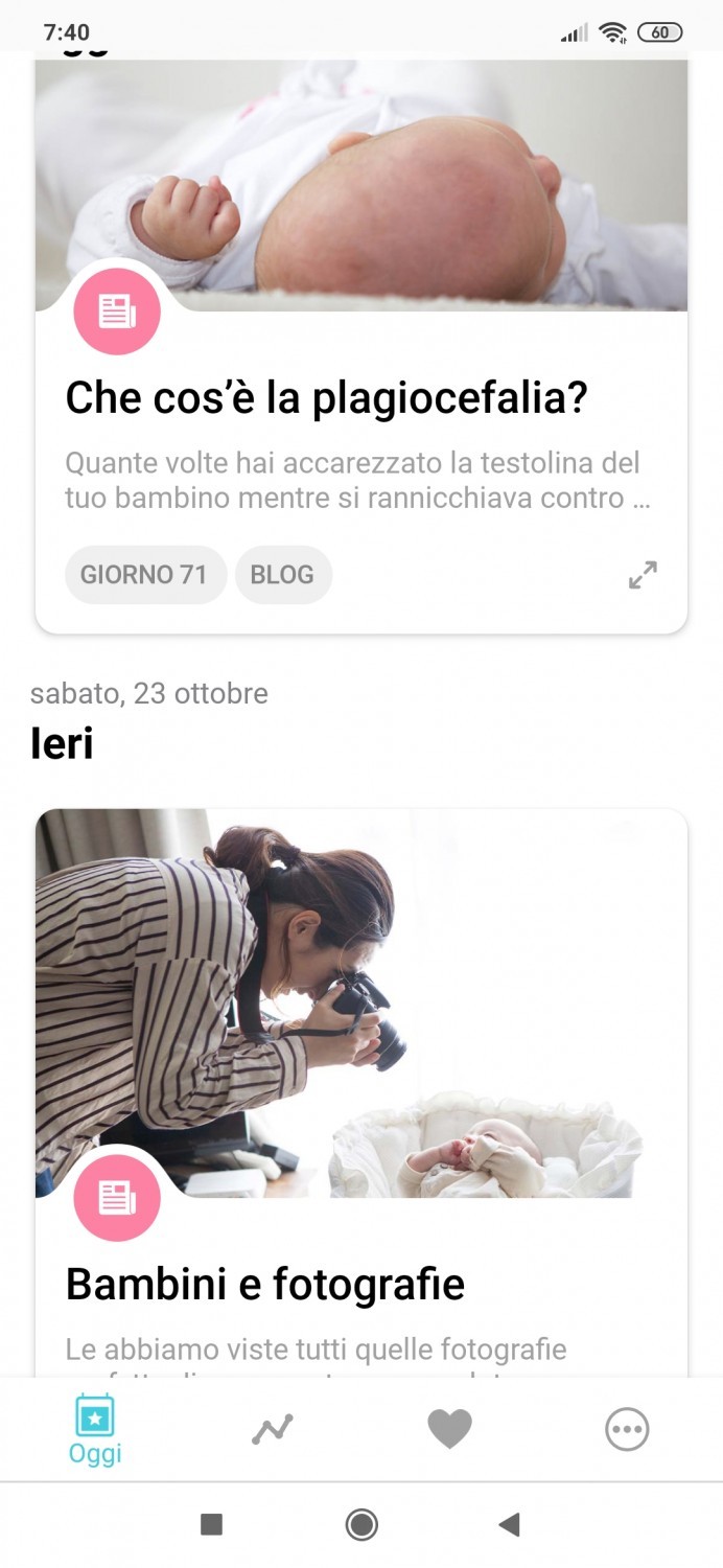 Monitora il suo sviluppo attraverso strumenti per seguire le tappe fondamentali di crescita, i pasti, la nanna, la salute, i pannolini. Raccoglie informazioni attraverso la raccolta di guide sulla genitorialità, consigli per la ripresa dopo il parto e articoli su allattamento e sullo sviluppo settimana dopo settimana.