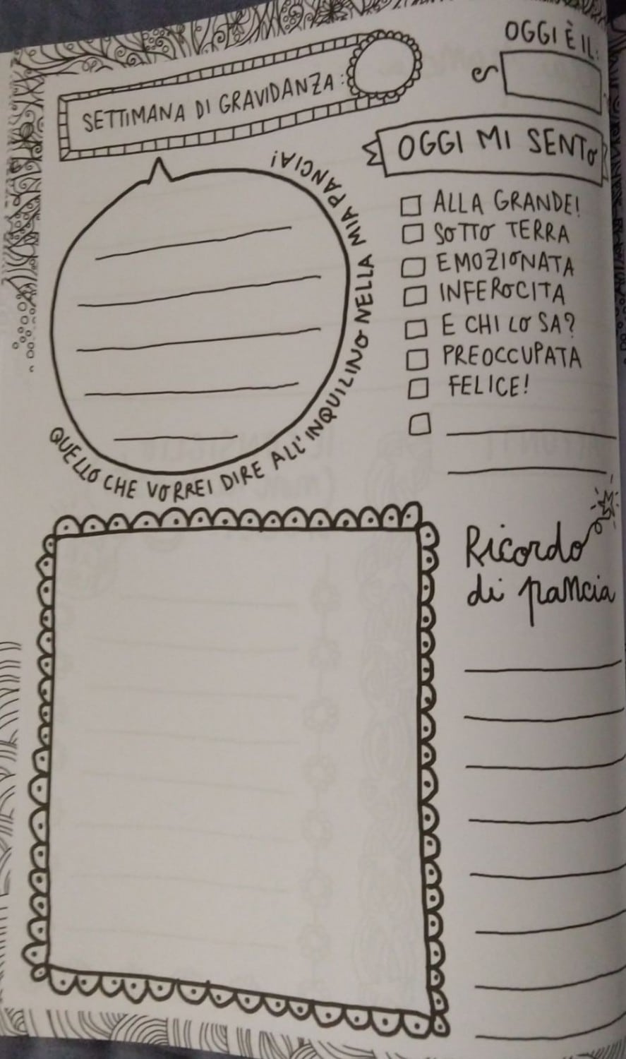 In bianco e nero, può essere personalizzato e colorato, scrivendo note, pensieri, ricordi, incollando foto, biglietti, ecografie e tanto altro.