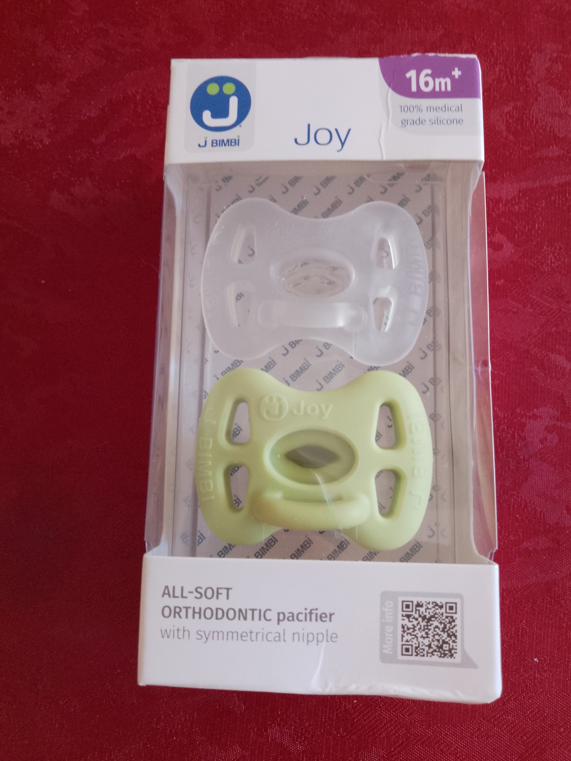 Il Succhietto Joy di J Bimbi è un succhietto ortodontico in silicone 100% medicale, morbido ed elastico. Realizzato in un unico pezzo, ha una tettarella simmetrica a goccia che si adatta in ogni posizione alla bocca del bambino e base sottile che consente una corretta chiusura della bocca, ma robusta per resistere ai dentini, se già spuntati. Accessibile in ogni sua parte per una completa e facile sterilizzazione, è dotato di scudo ergonomico con ampi fori di aerazione e microsfere massaggianti che assicurano una pelle asciutta e sana.