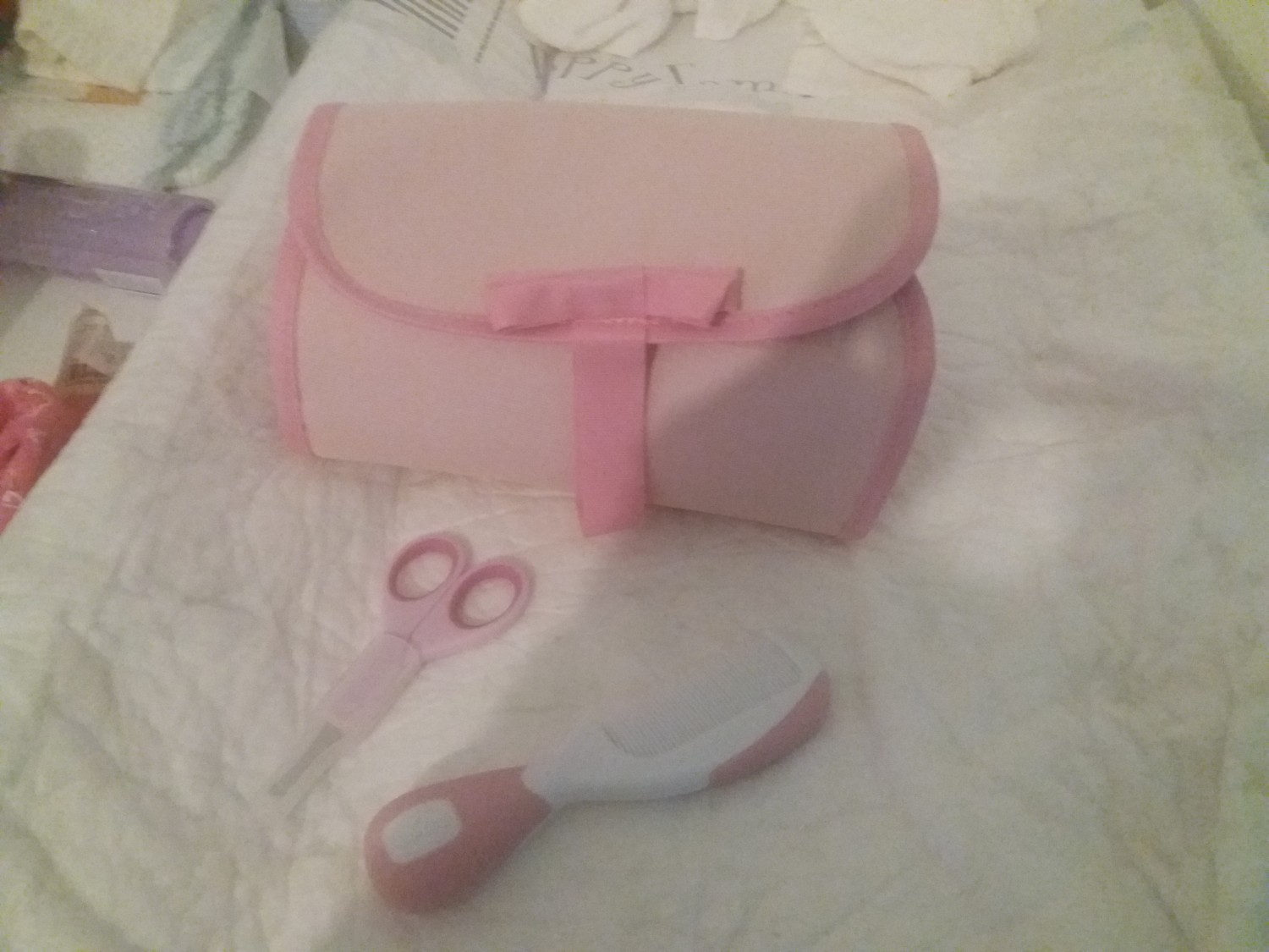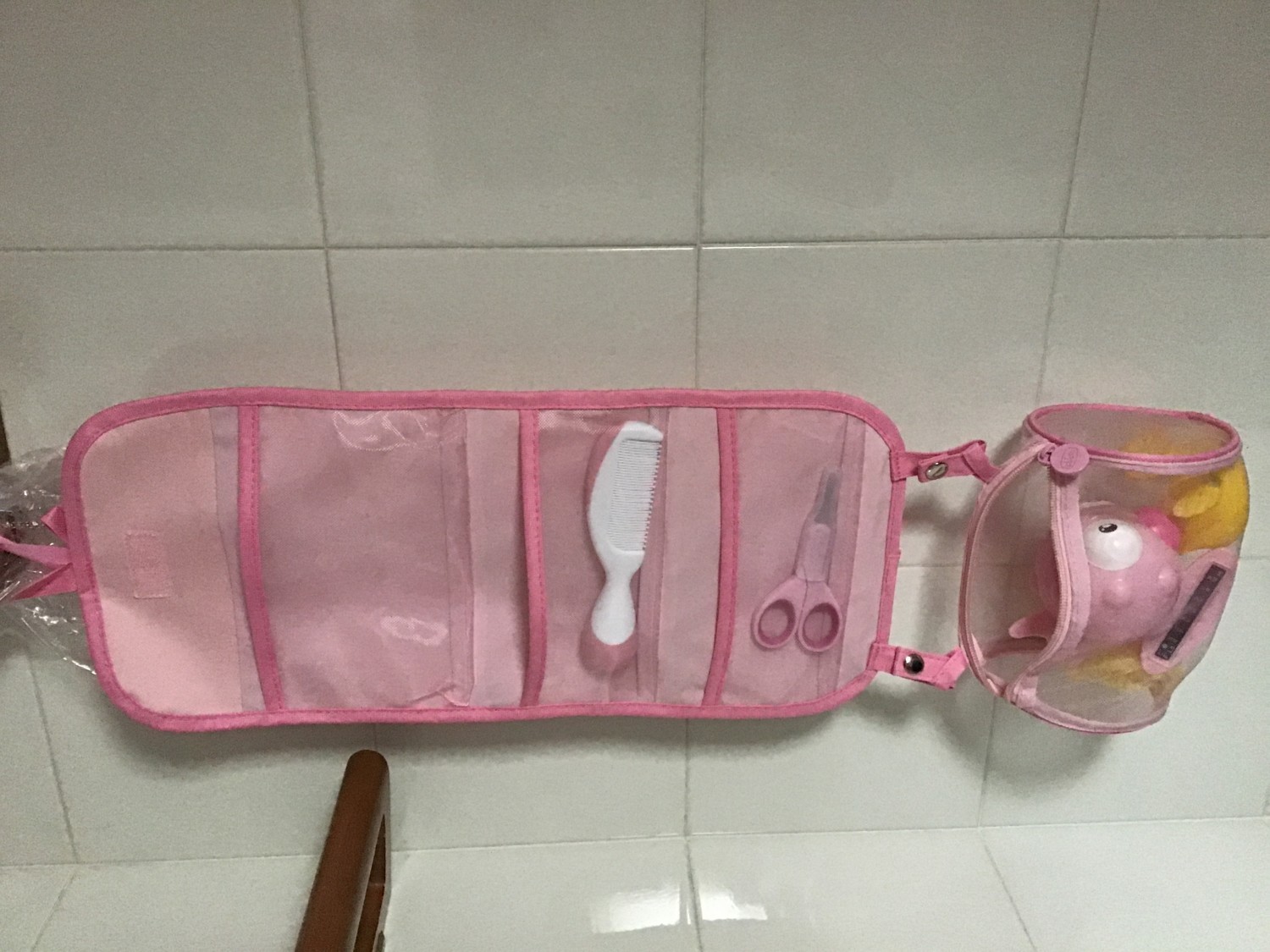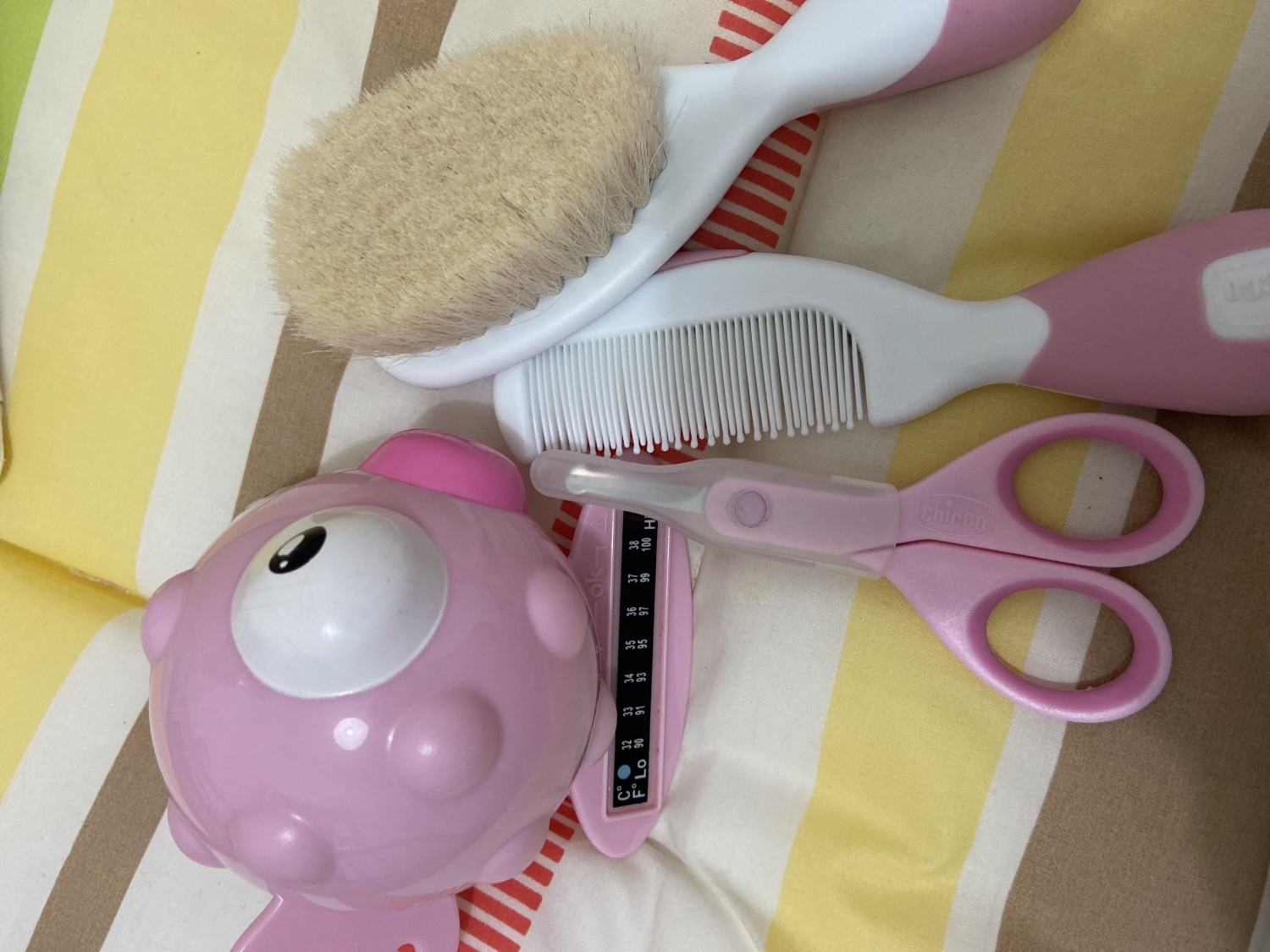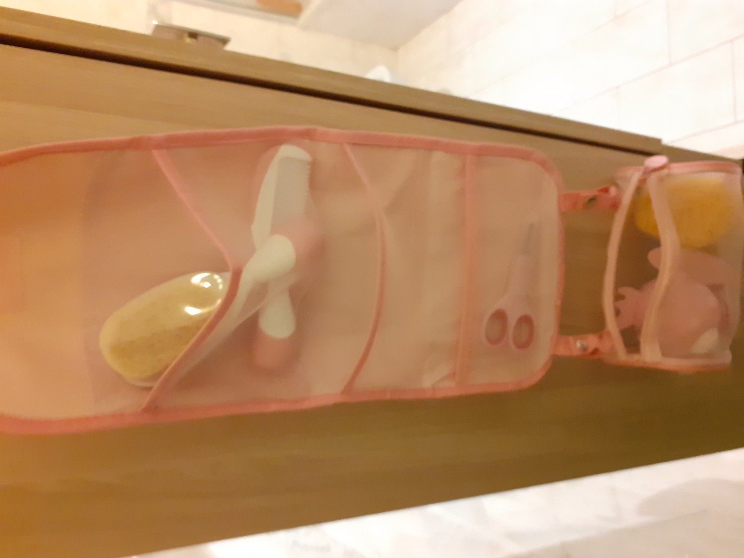 Contiene spazzola con setole naturali, pettine con punte arrotondate, spugna naturale, termometro da bagno a forma di pesciolino per verificare la temperatura dell'acqua del bagnetto, forbicine in acciaio inox con lame ricurve, punte arrotondate e cappuccio di protezione per le lame.