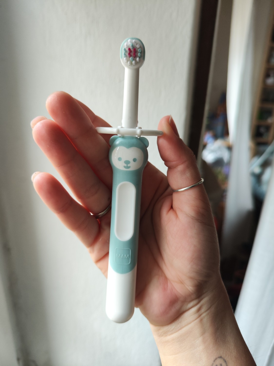 È stato il primo spazzolino di mia figlia. L'ha subito adorato e il lavaggio dei denti è diventato divertente. La protezione è molto utile ed evita che il bambino lo spinga troppo in fondo. Super consigliato