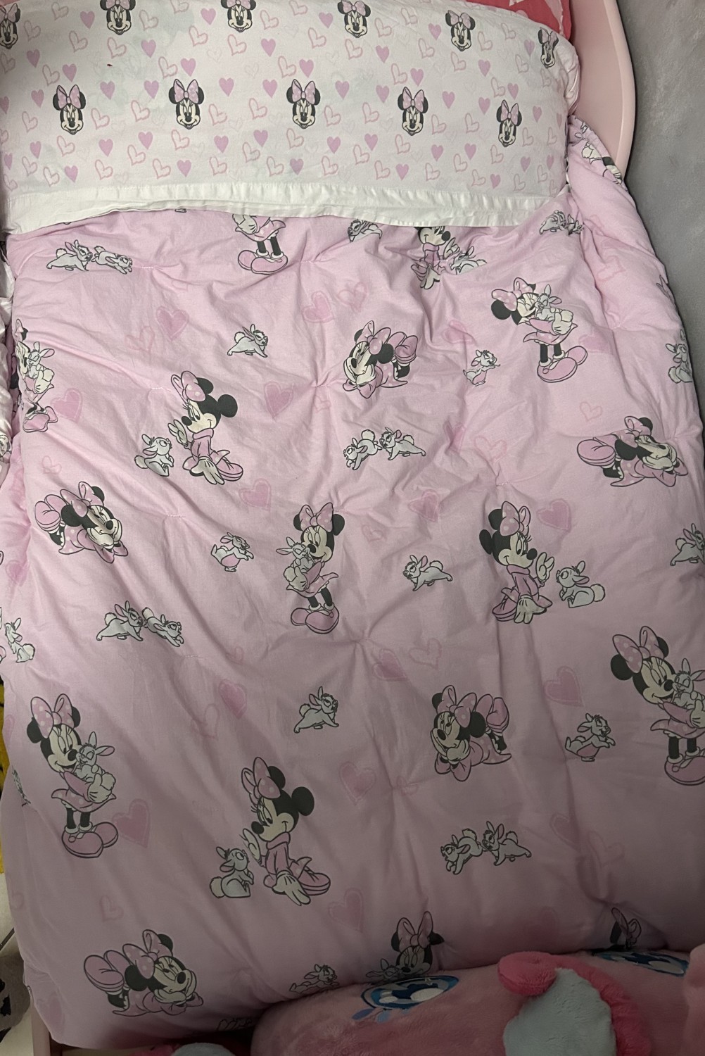 Sat lenzuola in cotone composto da: lenzuolo sotto con angoli, lenzuolo sopra e federa tutto con stampa con Minnie. Il cotone è ottimo a prova di ripetuti lavaggi. Super consigliato sia per la fantasia delicata con il personaggio di Minni, sia per la qualità del cotone.