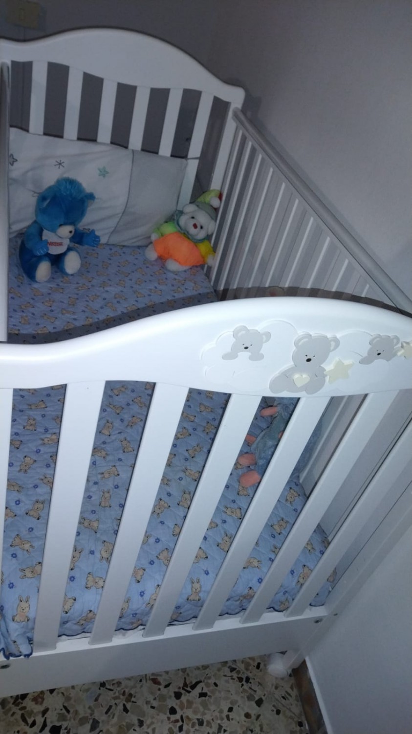 Lettino della collezione Star, decorato da simpatici orsetti. Realizzato in legno massello di faggio, è caratterizzato da una testiera con doghe, da un ampio cassetto portaoggetti e 4 ruote in gomma, di cui 2 frenanti.