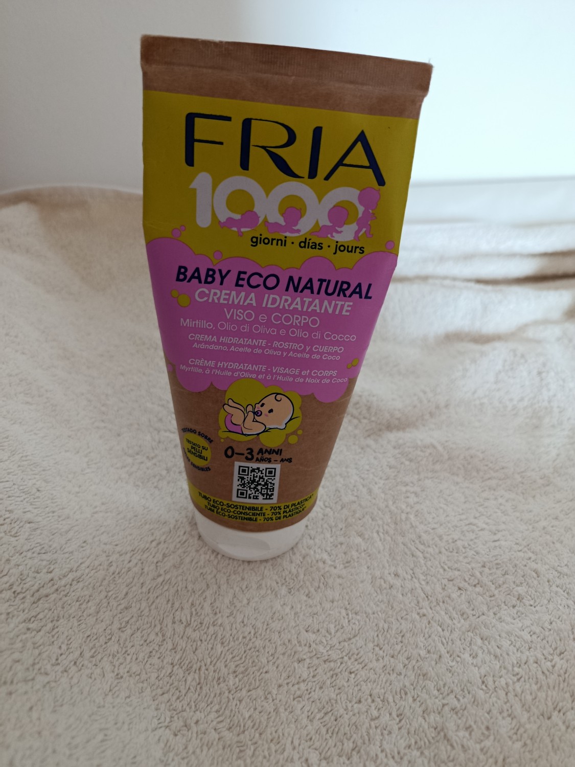 Crema Idratante Baby Eco Natural della linea Fria 1000 Giorni, una linea di cosmetici adatti alla mamma e al bambino che offre prodotti sicuri, naturali e formulati senza sostanze pericolose, con attivi naturali che non agiscono sul sistema endocrino.