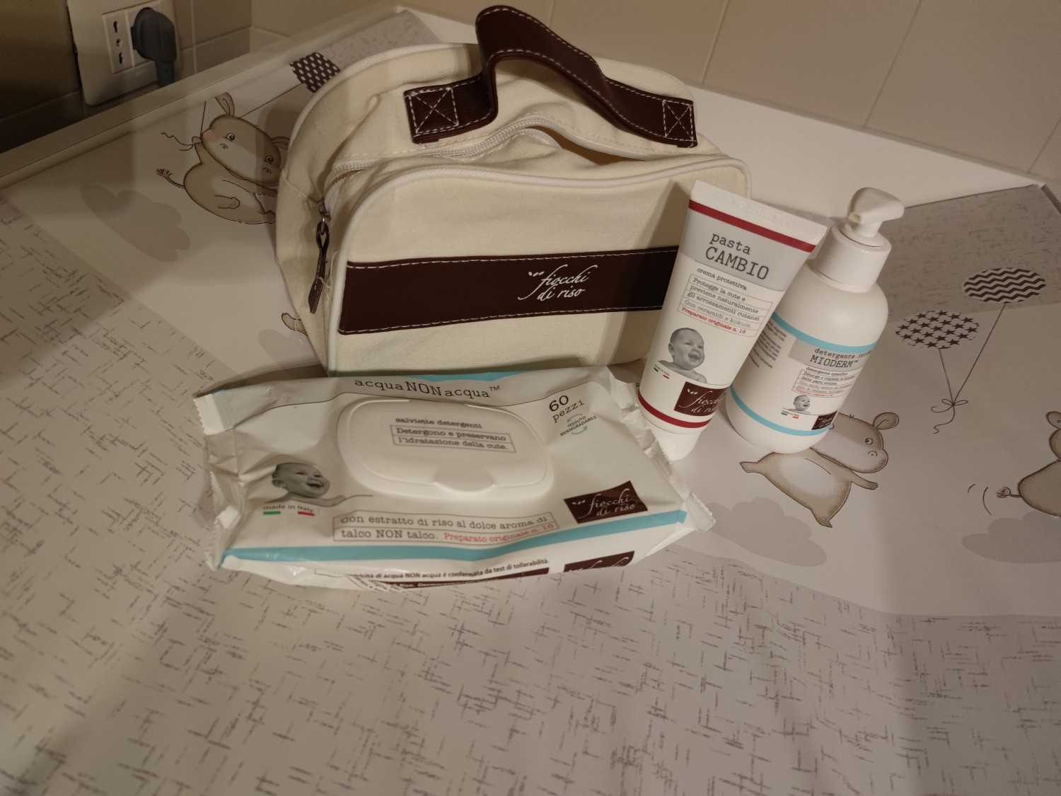 Kit contenente tre prodotti utili al momento del cambio del pannolino, in un pratico beauty: 1 detergente intimo Mioderm da 240 ml, 1 pasta cambio da 100 ml e 1 confezione di salviette Acqua non Acqua da 60 pezzi.