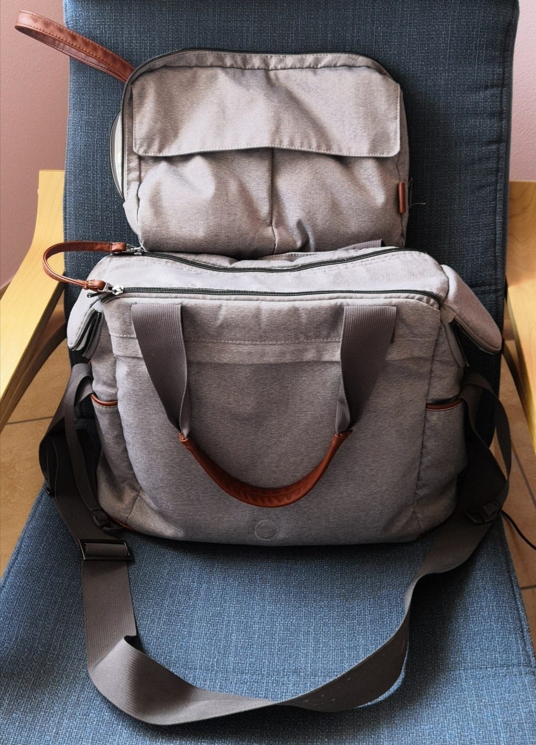 Borsa davvero capiente e ben strutturata. Dorata di due tasche termiche, ideali per il trasporto di latte/pappe. Oltre agli scompartimenti interni, la parte del cambio pannolino staccabile è utilussima, per brevi tragitti si usa solo quella.