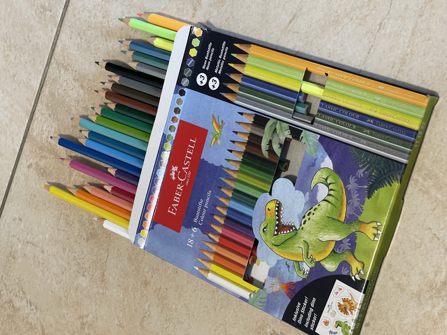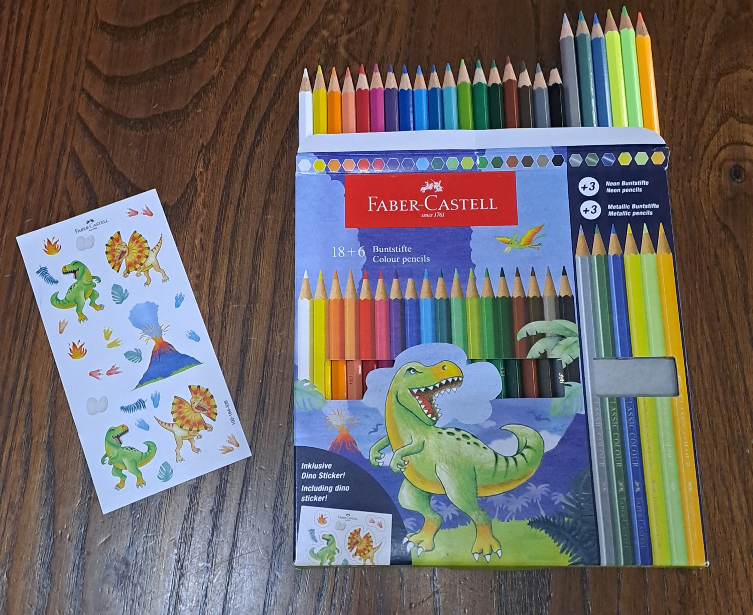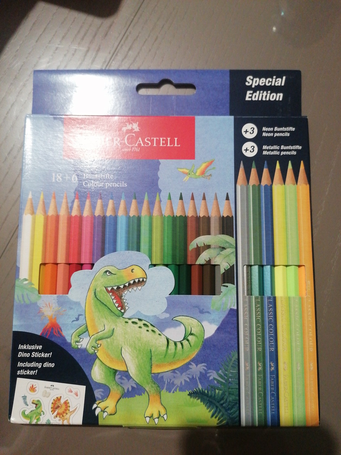 Le Matite Colorate Classic Dinosauro 18+6 di Faber-Castell sono matite colorate Classic con design a tema dinosauro. La confezione contiene 18 matite colorate esagonali in colori classici e 6 matite colorate in colori pastello. Dai colori brillanti e vivaci, offrono massima resistenza alla rottura grazie al processo di incollaggio (SV). Inclusi adesivi a forma dinosauro.