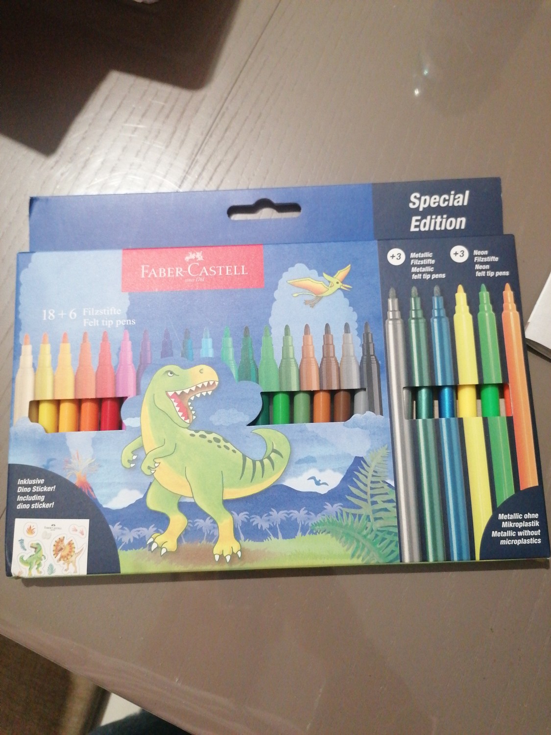 I Pennarelli Dinosauro 18+6 di Faber-Castell sono pennarelli colorati a tema Dinosauro. La confezione contiene 18 pennarelli colori standard + 3 pennarelli colori neon e 3 pennarelli effetto metallico. Dai colori brillanti, hanno la punta solida che non rientra, inchiostro a base d'acqua e sono ideali per disegnare e schizzare su carta, cartone, legno, grazie alle loro fibre adatte ad ogni occasione: punta grande per colorare ampie aree, punta sottile per disegnare linee e sottolineare dettagli.
