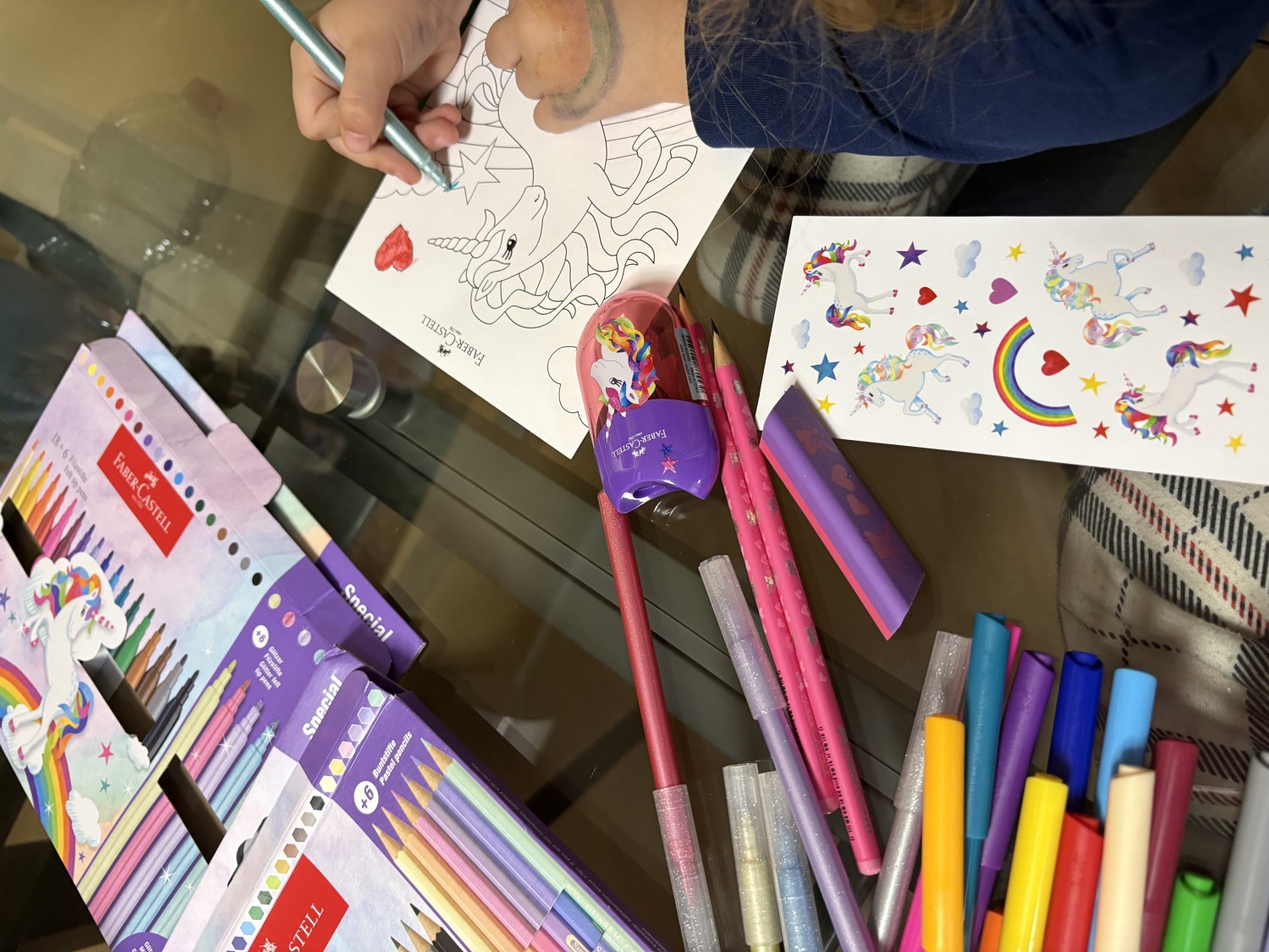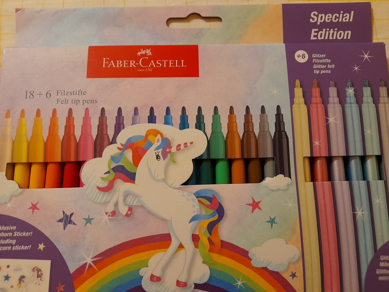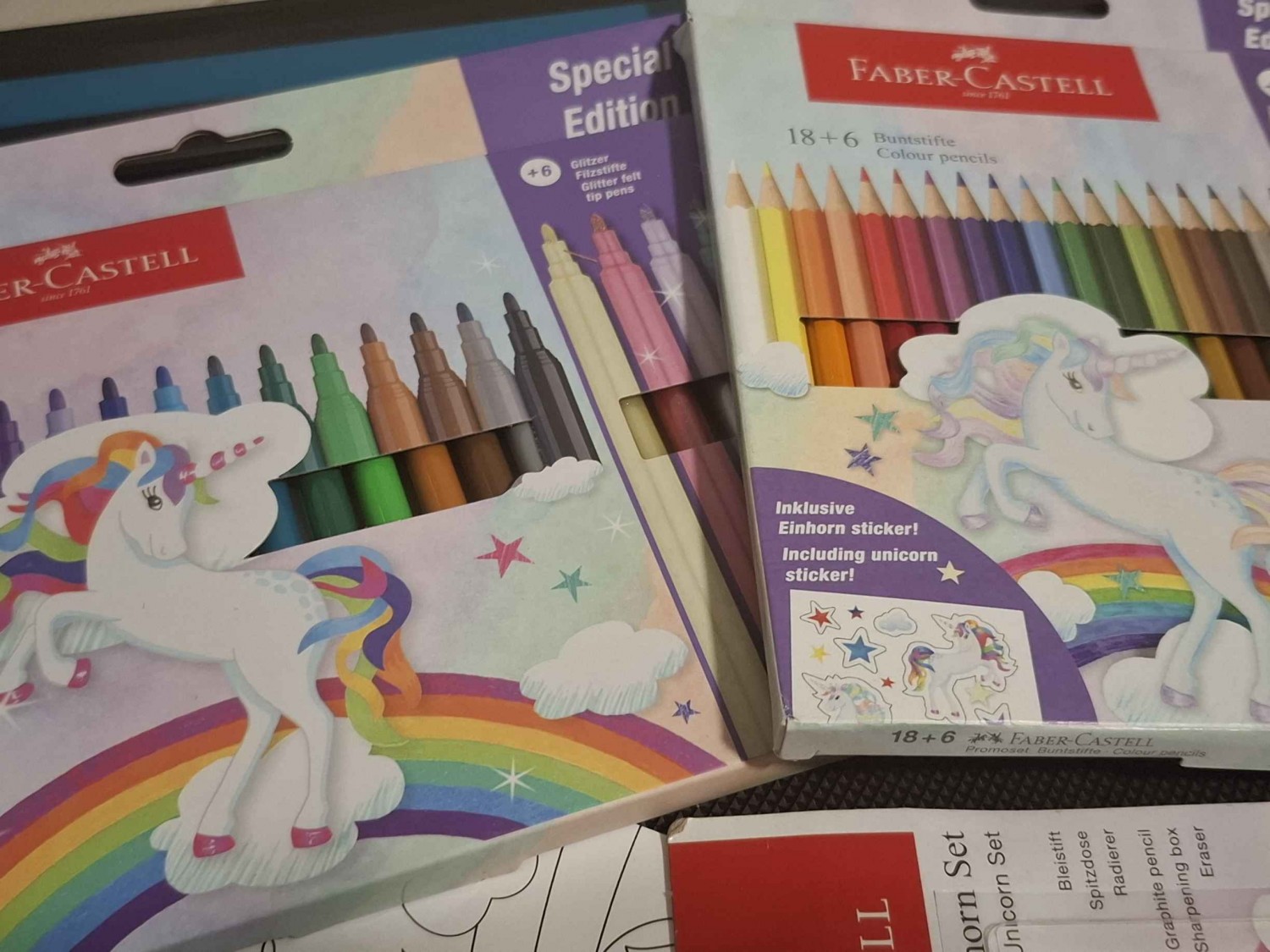 I Pennarelli Superlavabili Unicorn 18+6 di Faber-Castell sono pennarelli colorati a tema Unicorno. La confezione contiene 18 pennarelli colori standard + 6 pennarelli colori pastello effetto glitter. Dai colori brillanti, hanno la punta solida che non rientra, inchiostro a base d'acqua e sono ideali per disegnare e schizzare su carta, cartone, legno, grazie alle loro fibre adatte ad ogni occasione: punta grande per colorare ampie aree, punta sottile per disegnare linee e sottolineare dettagli.