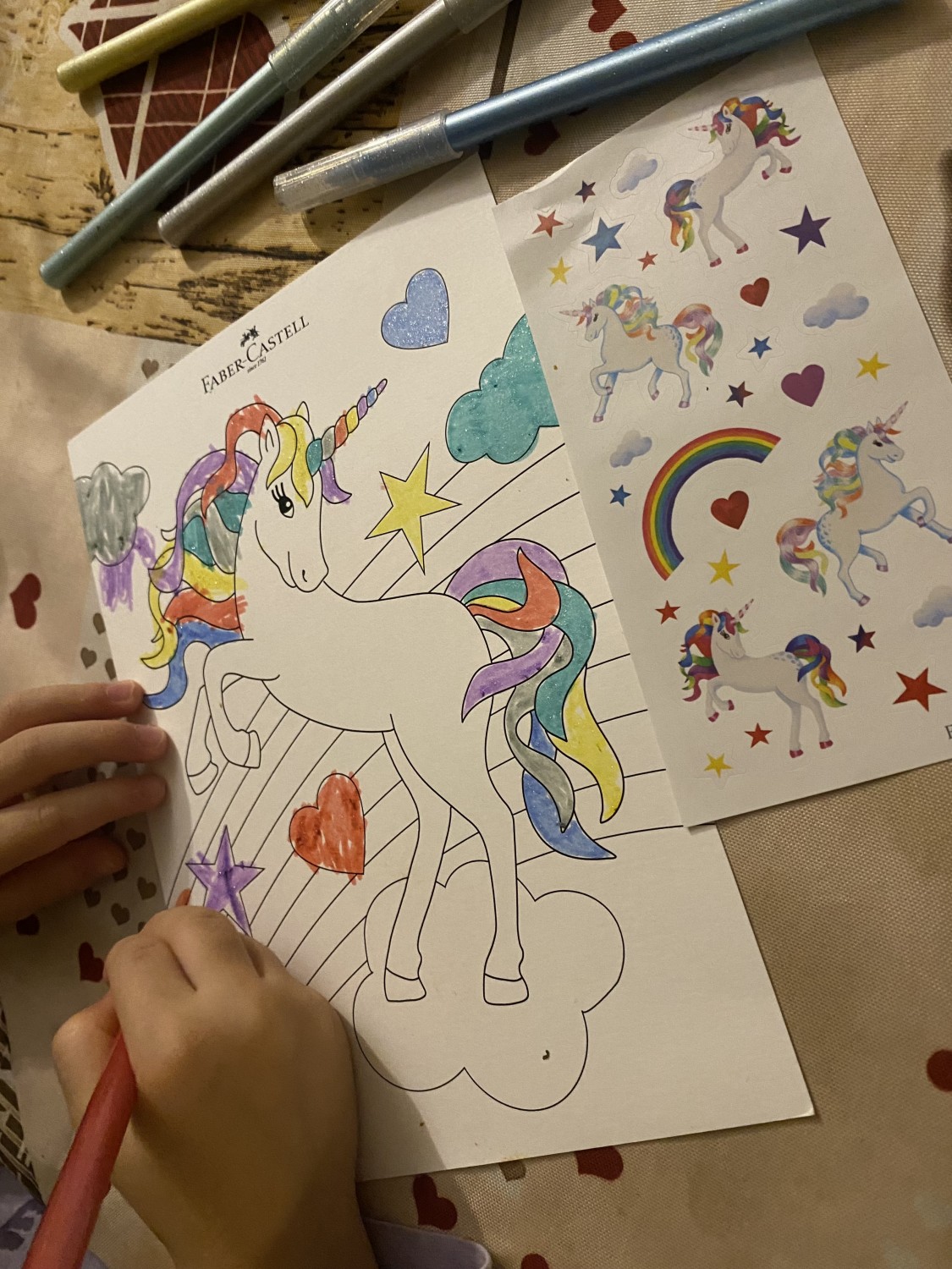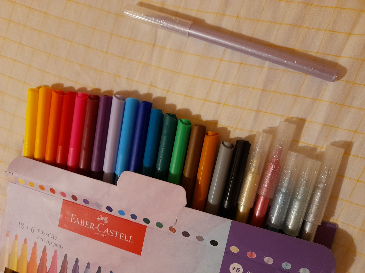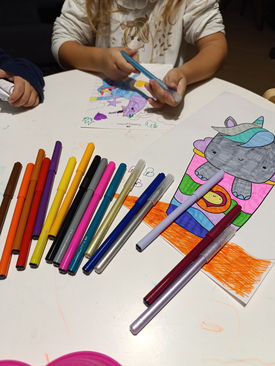 I Pennarelli Superlavabili Unicorn 18+6 di Faber-Castell sono pennarelli colorati a tema Unicorno. La confezione contiene 18 pennarelli colori standard + 6 pennarelli colori pastello effetto glitter. Dai colori brillanti, hanno la punta solida che non rientra, inchiostro a base d'acqua e sono ideali per disegnare e schizzare su carta, cartone, legno, grazie alle loro fibre adatte ad ogni occasione: punta grande per colorare ampie aree, punta sottile per disegnare linee e sottolineare dettagli.