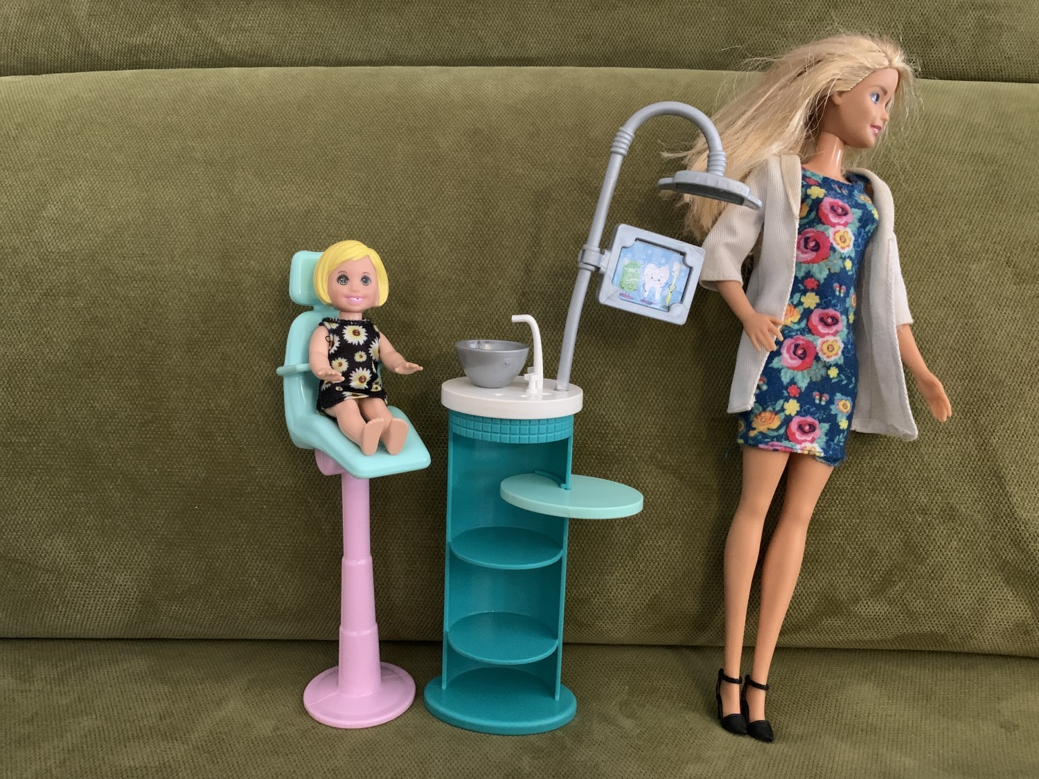 Play set di Barbie dentista. Indossa un vestito blu con stampa floreale, camice bianco e scarpe ed è pronta a visitare la sua piccola paziente, che ha perso un dentino. Inclusi tanti accessori a tema, come la sedia da dentista, il lavandino con lampada e monitor, uno spazzolino da denti, occhiali protettivi e uno stampo per denti. Per un gioco di ruolo dove lasciar correre fantasia e immaginazione.