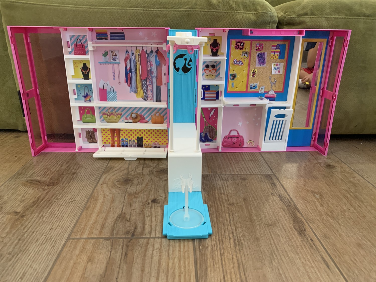 Playset di Barbie con oltre 10 aree per riporre gli accessori, un porta abiti girevole, una specchiera, un tavolino personalizzabile e oltre 25 abiti e accessori. Barbie può sfoggiare 4 outfit: un abito da party rosa luccicante, un look da giorno con camicia a scacchi e gonna floreale, un completo da pediatra con vestito a righe e camice bianco e una muta da sub.