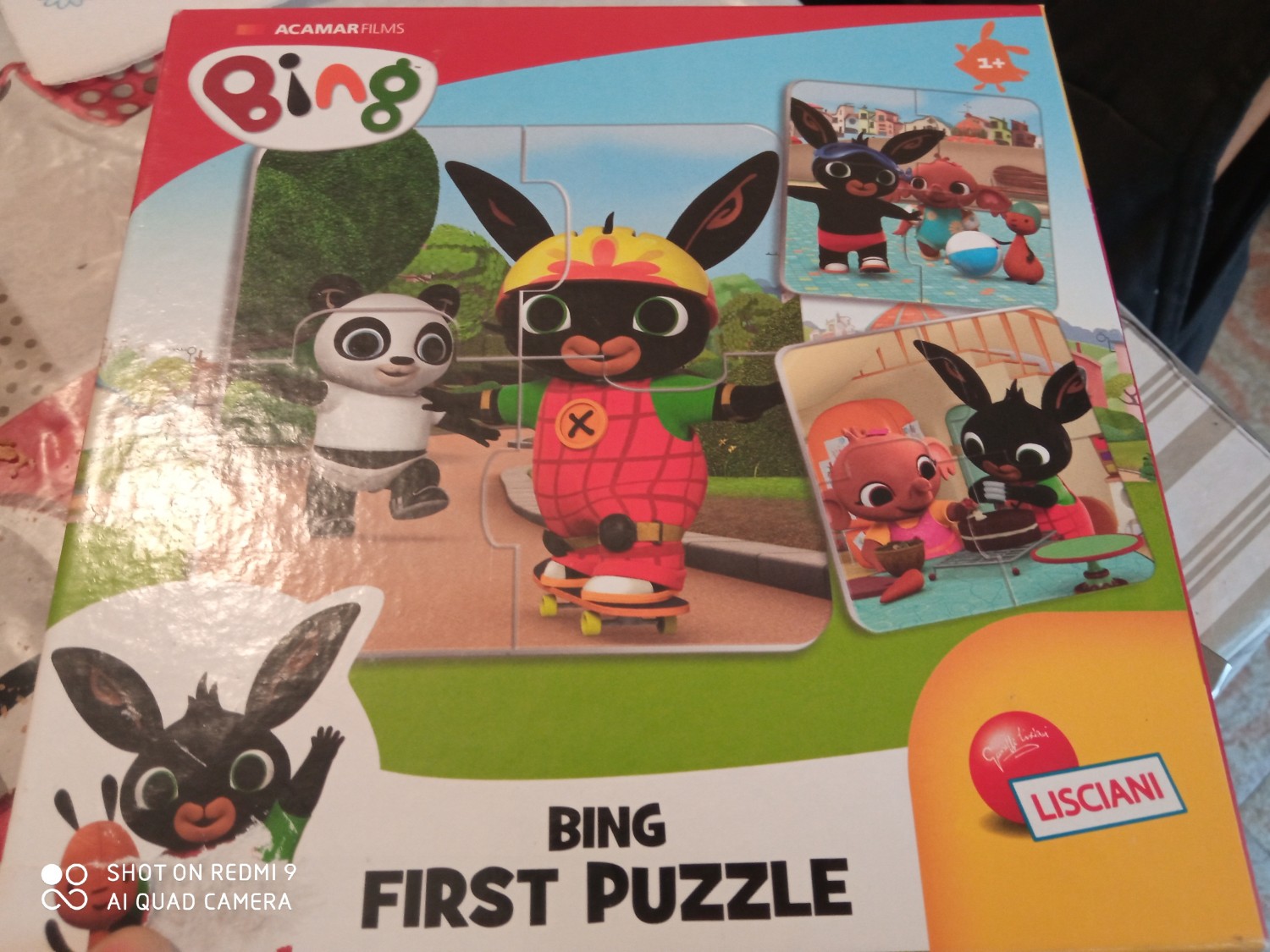 Puzzle di Bing! pensato per i bambini più piccoli, per realizzare 8 puzzle da 4 tessere ciascuno, di alto spessore e con incastri autocorrettivi, che aiuta a sviluppare il pensiero logico, la memoria e l'attenzione.