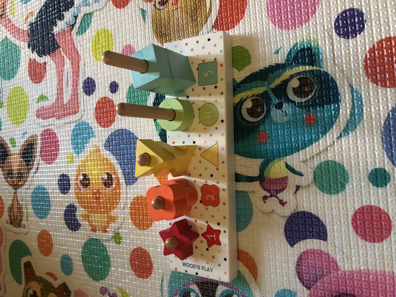 15 forme impilabili in 5 colori e 5 forme diverse: stella rossa, fiore arancione, triangolo giallo, cerchio verde, triangolo azzurro. Il bambino giocando, oltre ad impilare i blocchi, imparerà a riconoscere forme, colori e numeri. Il gioco stimola lo sviluppo e la coordinazione occhio-mano e le capacità logiche.