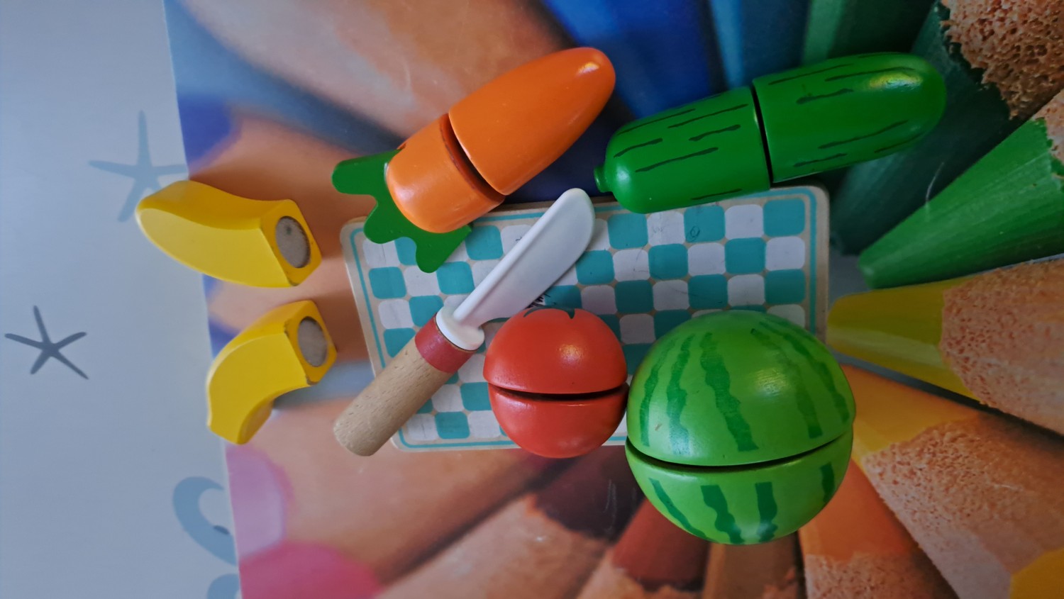 Set di cinque frutti colorati, pretagliati e tenuti insieme dal velcro. Il set, completamente realizzato in legno, include un finto coltello, con i quale il bambino potrà giocare a tagliare la frutta e a preparare una macedonia colorata. Il gioco stimola le capacità motorie e il riconoscimento di forme e colori.
