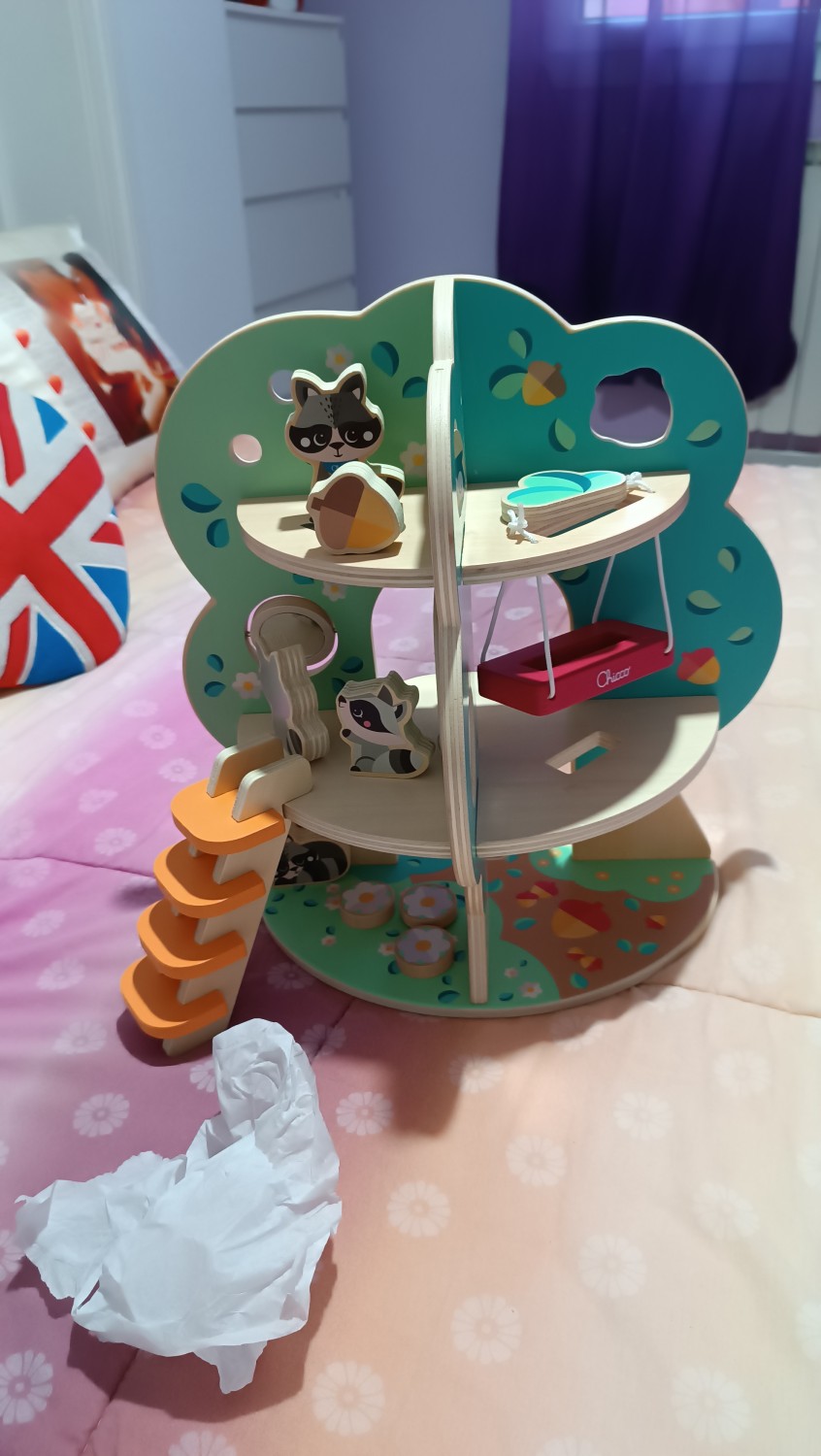 Un gioco davvero dolcissimo! Mi piace che sia realizzato in legno di ottima qualità, con colori delicati e un design curato nei minimi dettagli. I bambini si divertono tantissimo a inventare storie con i procioni e a muovere i vari elementi dell’albero. Apprezzo molto anche l’aspetto sostenibile: il legno proviene da foreste gestite responsabilmente, e si percepisce subito la qualità e la solidità del prodotto. È un gioco che stimola la fantasia, la manualità e la creatività, perfetto come regalo educativo e duraturo nel tempo. Assolutamente consigliato!