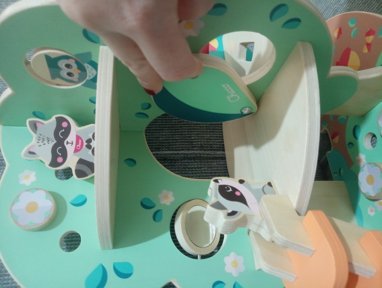 A forma di albero, con 2 piani, un giardino e 4 procioni; ricco di dettagli, invita il bambino a trovare i procioni che giocano a nascondino intorno all’albero e stimola la sua creatività e la sua manualità. Potrà aprire un passaggio segreto sollevando e abbassando il cespuglio, ruotare lo specchio per creare effetti luce, inserire i fiori ad incastro nei fori per decorare la chioma dell'albero o il giardino.