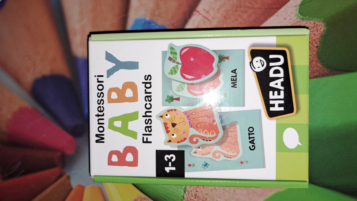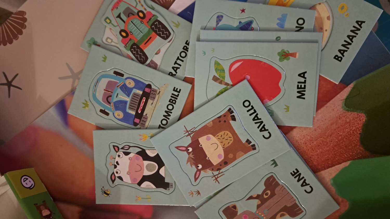 Gioco educatico che aiuta a sviluppare l'intelligenza linguistica: carte realizzate con speciali sagome ad incastro, che si ispirano alla lezione in 3 tempi di Maria Montessori, basata sull’ascolto, la pronuncia e la memorizzazione delle parole. Utili per ascoltare e imparare a pronunciare le prime parole attraverso il gioco. Contiene 12 grandi carte che raffigurano animali, frutta, mezzi di trasporto e 12 sagome colorate.