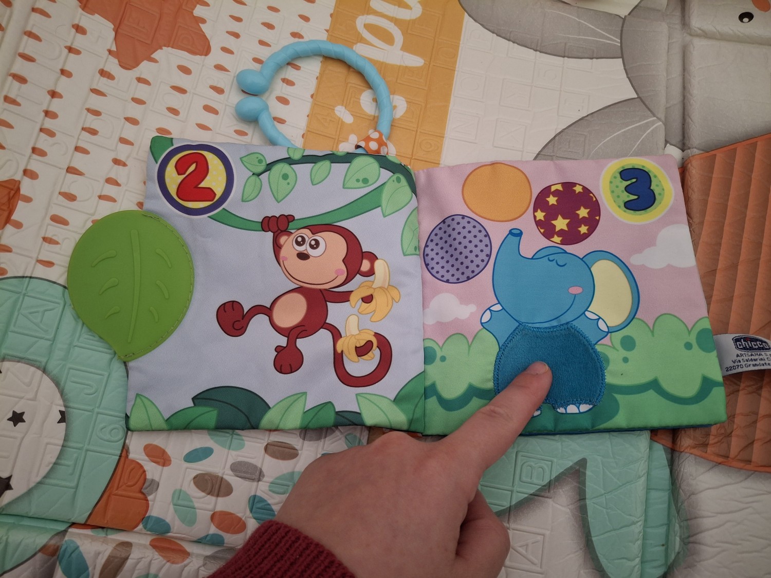 Adoro questo libricino, mio figlio lo ha sempre con sé nei momenti di gioco e di relax. Da quando ha iniziato la dentizione, è diventato uno dei suoi giochi preferiti: lo sfoglia, lo gira e lo stropiccia, ma soprattutto lo mette in bocca e lo mordicchia. Il libricino è dotato di occhiello per appenderlo e, cosa più importante, si può comodamente lavare.