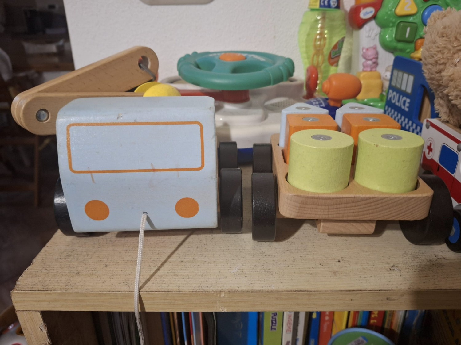 Gru con cubi colorati in legno massiccio di faggio. Solido e resistente, ha il braccio dotato di calamita che aiuta a sollevare e manovrare il carico. Il rimorchio è rimovibile. Con cordoncino per tirarlo ovunque. Stimola lo sviluppo delle abilità motorie fini, del pensiero logico e della coordinazione occhio-mano del bambino.