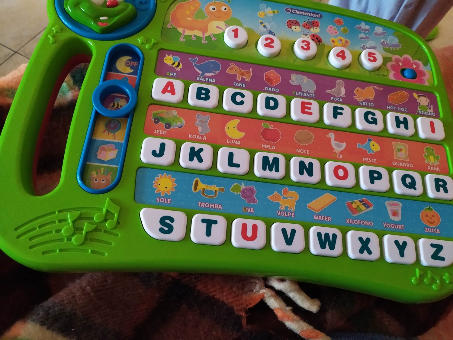 ricevuto come regalo, sviluppa la creativita' della bimba, si diverte molto con suoni e colori.permette di imparare l'alfabeto divertendosi e ci sono suoni degli animali.bello!