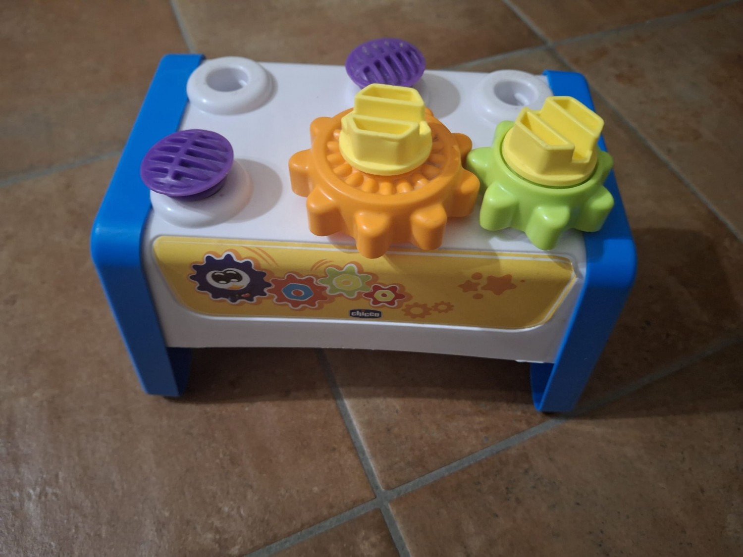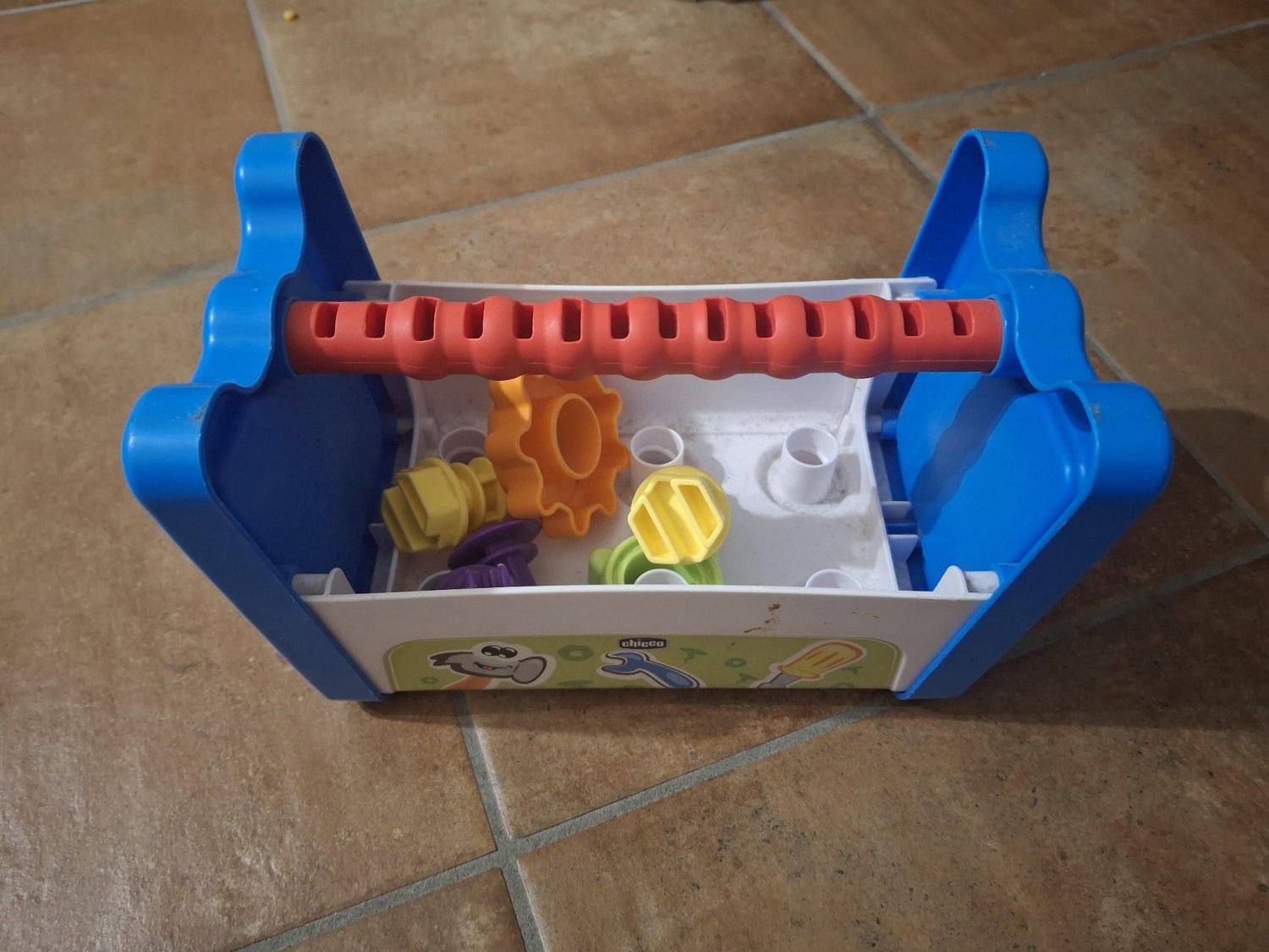 La cassetta degli attrezzi è un gioco per bambini completo, composto da 13 pezzi diversi: un martello, un cacciavite, una chiave inglese, viti, ingranaggi e bulloni con cui scatenare la fantasia. Il bambino potrà posizionare gli ingranaggi nella giusta sequenza per farli girare; alla fine del gioco, potrà capovolgere la cassetta e raccogliere tutti i pezzi.