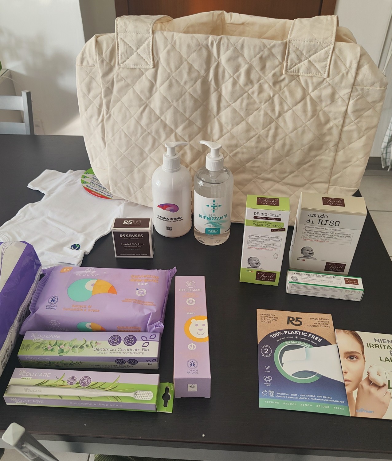 Borsa pratica e funzionale da portare in ospedale al momento del parto, realizzata in tessuto neutro. Contiene una selezione di prodotti utili per accompagnare la neo-mamma e il suo bebè fin dalla nascita, nel momento del pre e del post parto. Un'idea regalo utile che sarà apprezzata da tutte le neomamme, per avere sempre a portata di mano tutto l'occorrente per la cura e l'igiene di mamma e bebè.